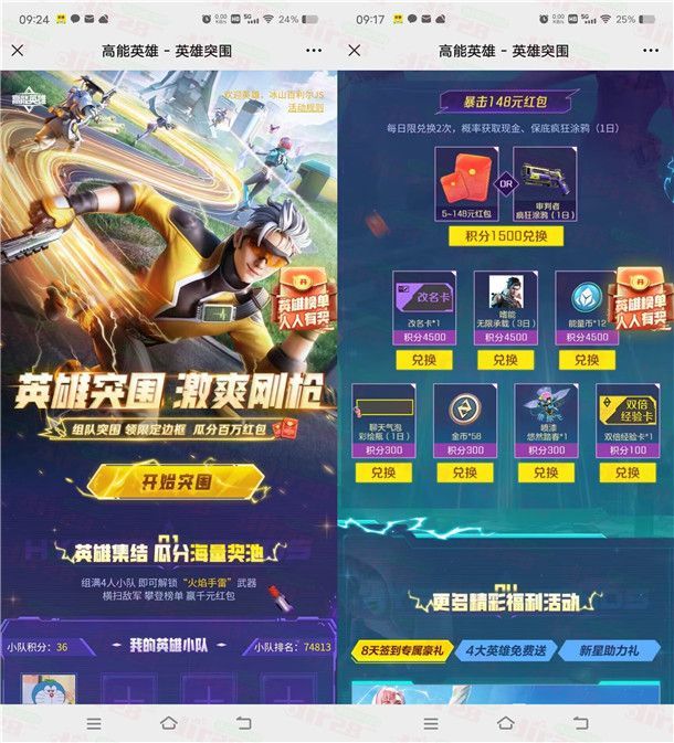参加高能英雄举办的组队突围瓜分百万红包活动,通过打开微信和手机QQ进去活动里,不组队也可以,只要在突围小游戏中捡金币就行(打怪得到的金币很少),累积得到1500金币可以兑换抽奖1次,有机会中到5-148元微信红包、5-148个Q币,微信是抽红包、QQ是抽Q币,非必中。