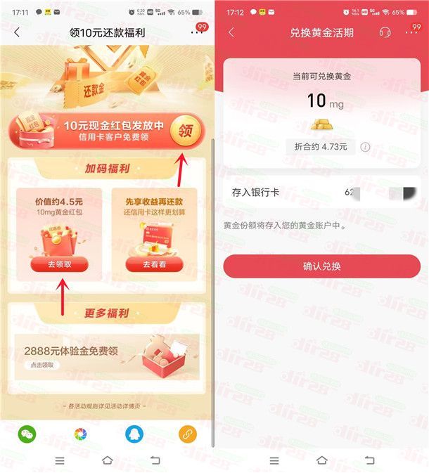 粗暴 招商银行简单领10元现金红包+4.7元黄金红包秒到