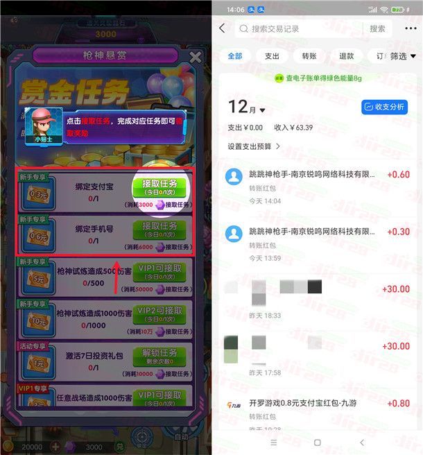 又来一个简单的游戏领红包活动,只有安卓手机才可以参加,通过下载打开跳跳神枪手APP,微信登录后先按照提示引导简单点几下绑定支付宝就可以领到0.3元支付宝现金,然后再游戏里再玩几分钟领到6000钻石再兑换0.6元支付宝现金,合计每个号可以领到0.9元支付宝现金,秒到支付宝余额里。