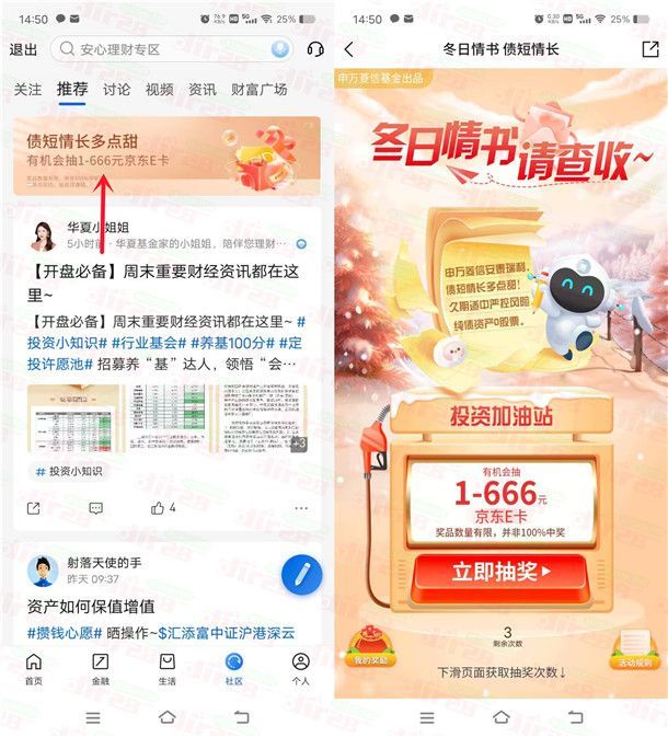 小编提示:打开交通银行APP,点底部【社区】再点顶部滚动条图【债短情长多点甜】进去,下拉页面完成3个简单的任务可以抽奖3次(关注+浏览+发帖任务,很简单),刚中1元京东卡,非必中
