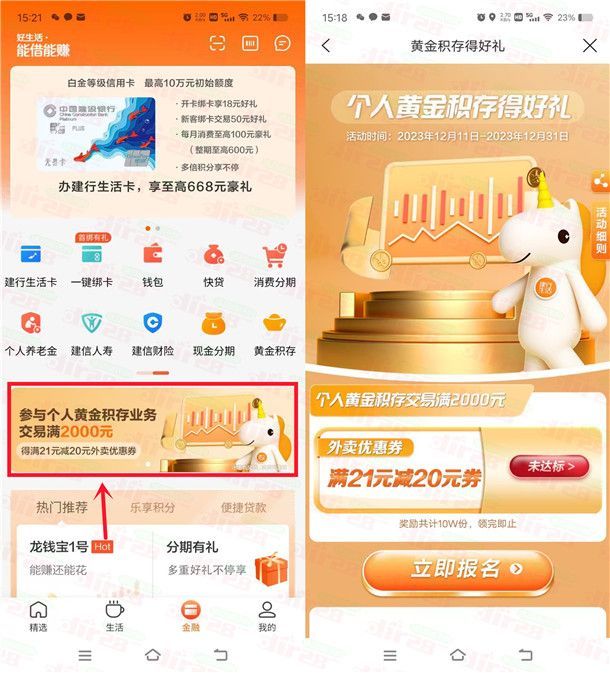 建行生活黄金积存得好礼活动5元撸20元外卖券 限量10万份