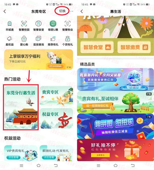2、再点击【东莞分行惠生活】进去下拉页面到底点击【好礼抽不停】进去活动里(全国用户可参加,部分用户如果提示非受邀就参加不了)