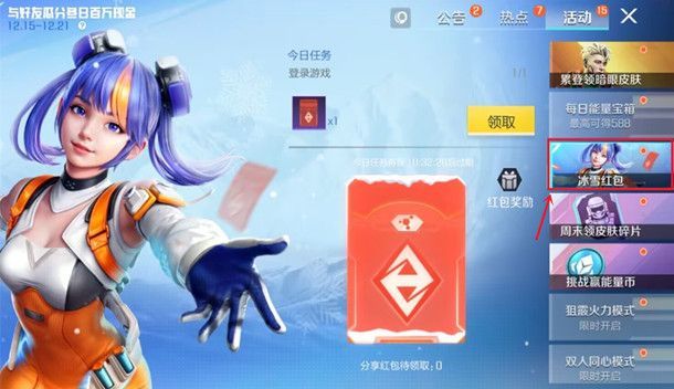 1、进去高能英雄手游里面(安卓手机也可以去腾讯先锋APP搜索【高能英雄】秒玩进去游戏里),登录游戏点击右侧【活动】再点击【冰雪红包】进去领取红包并且分享出去(微信和QQ都可以登录参加,微信是抽红包、QQ是抽Q币)