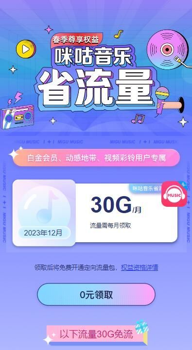 移动用户免费领咪咕音乐30GB流量,有需要的可以去领下。