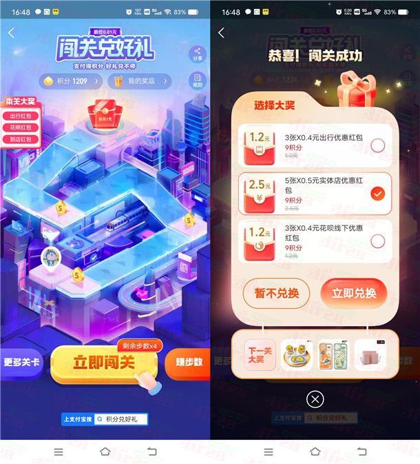 小编提示:打开支付宝APP扫码进去,一共有4关,在小游戏还可以领到支付宝积分,刚刚第一关通关领到2.5元支付宝实体店红包(每天可以用0.5元),第二关是499积分兑实物,后面的关卡我还玩到那里去