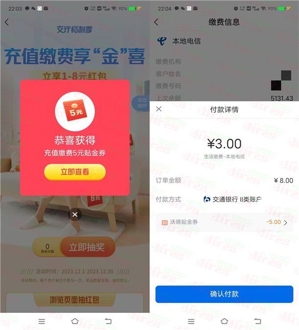 参加交通银行举办的充值缴费享金喜活动,通过打开交通银行APP进去活动里,完成页面的一个简单的浏览5秒的任务就可以领取1次抽奖机会,有机会中到1-8元贴金支付券,小编测试中到5元(满8元使用),可以在交通银行APP交水电费、充手机话费抵扣(有的地区可以自定义金额充话费),注册过交通银行二类电子卡的可以去。