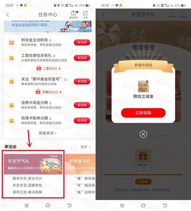小编提示:打开中国工商银行APP搜索【任务中心】进去,下拉页面在享活动那里点【冬至节气礼】进去,完成3个简单的浏览任务抽卡,集齐3张不同的卡片可以合成抽奖,如果没有集齐也可以跟好友相互赠送卡片,刚中1.66元,非必中