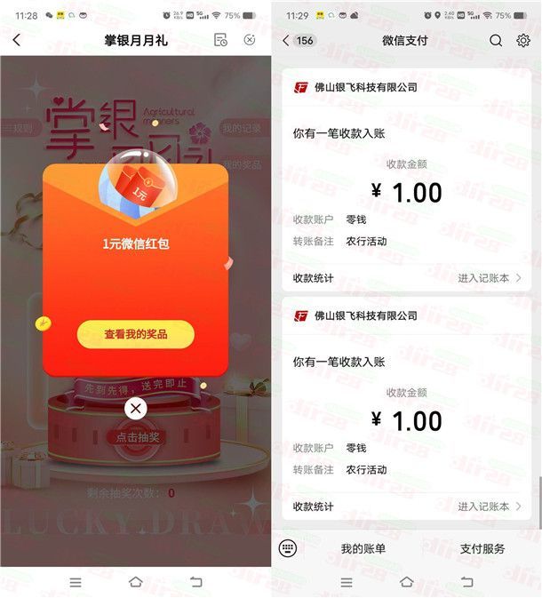 小编提示:手机扫码跳转到中国农业银行APP,里面几个活动都可以去(全国都可以去,但是部分用户参加不了),先支付再抽(支付的钱会原路退回,不会反撸),刚中2个1元,非必中