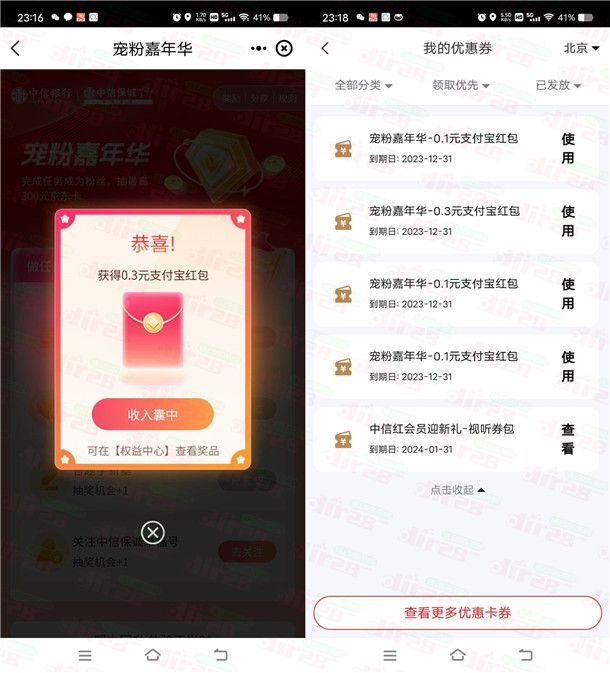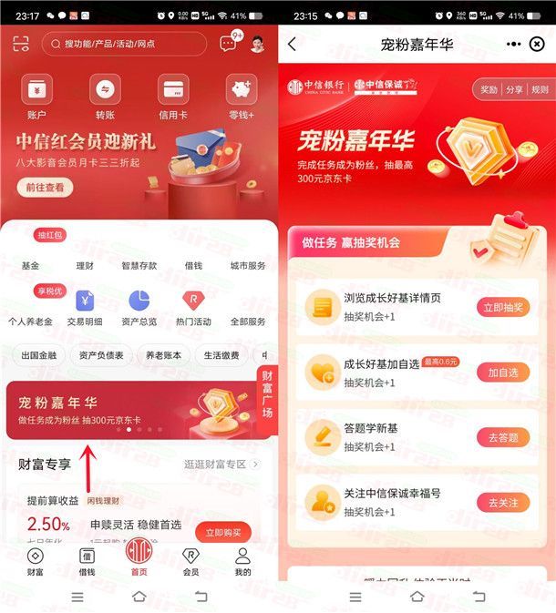 参加中信银行举办的宠粉嘉年华抽最高300元京东卡活动,通过打开中信银行APP进去活动里,完成4个简单的任务就可以抽奖4次(都是关注、浏览、添加自选收藏的任务,很简单),每次都有机会中带0.1-0.6元支付宝红包、京东卡,小编测试4次就会加起来中到0.6元支付宝红包。