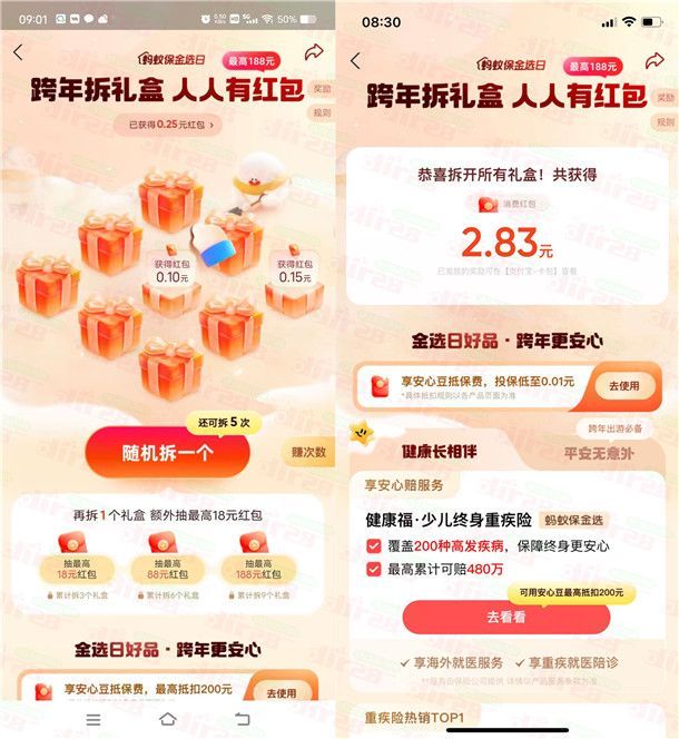 参加支付宝举办的蚂蚁保金选日跨年拆礼盒抽最高188元红包活动,支付宝金选日的活动每个月25号都会开启新一期,通过打开支付宝APP进去活动里,完成页面指定的任务可以开礼盒抽红包(金额随机,投保的那种给2次的任务给的红包金额会稍微大一点),红包到账支付宝卡包里,可以在支付宝APP付款的时候抵扣。