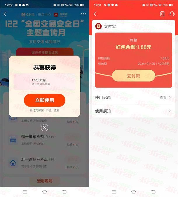 2、还有几个活动,打开支付宝APP搜索【赣服通】点击横幅图片【交通安全宣传月】进去,里面几个活动都可以去试试,小编测试中到1.88元支付宝红包,秒到支付宝卡包里,非必中