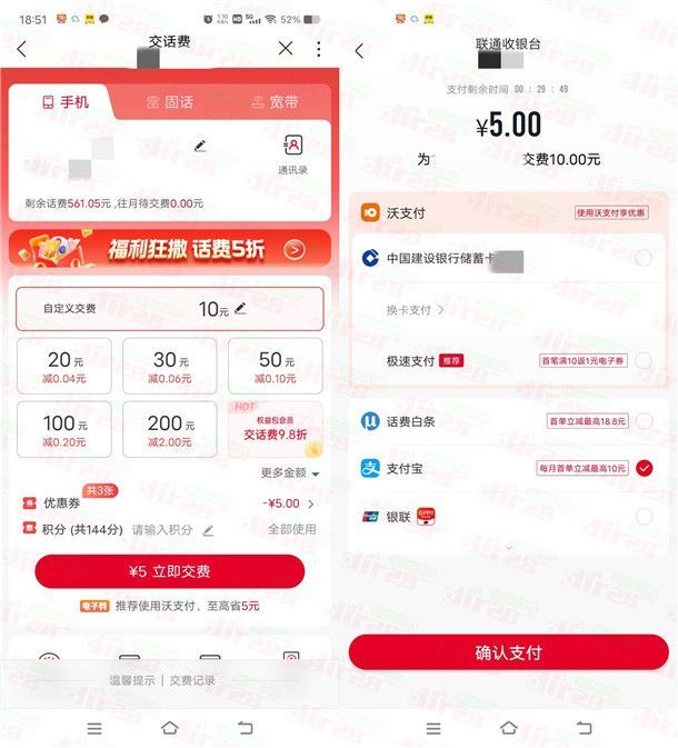 中国联通APP直接领5元话费券 可5充10元联通手机话费