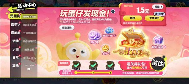 参加蛋仔派对举办的玩蛋仔发现金活动,通过下载打开蛋仔派对app手游(需要下载网易版本的蛋仔派对,别下错版本了),每天通过3关游戏可以开3次宝箱,有机会中到0.5-100元现金红包(并非必中,是概率中的,也有可能会中到游戏道具),累积得到的现金红包满1元提现到银行卡。还有一个蛋仔请吃KFC的活动跟好友组队通过5次关卡抽10-100元肯德基心意卡。