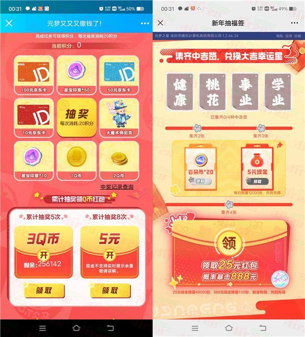 参加元梦之星举办的双周庆典和新年抽福签活动,通关打开手机QQ和微信进去活动里,每天完成指定的任务可以可以获得积分,消耗积分可以抽奖,累积抽奖达到指定次数可以领取3个Q币、5元现金红包,还可以抽Q币和京东卡,集福签的活动集齐指定数量的福签还可以领5-25个Q币、5-25元微信红包,数量限量。