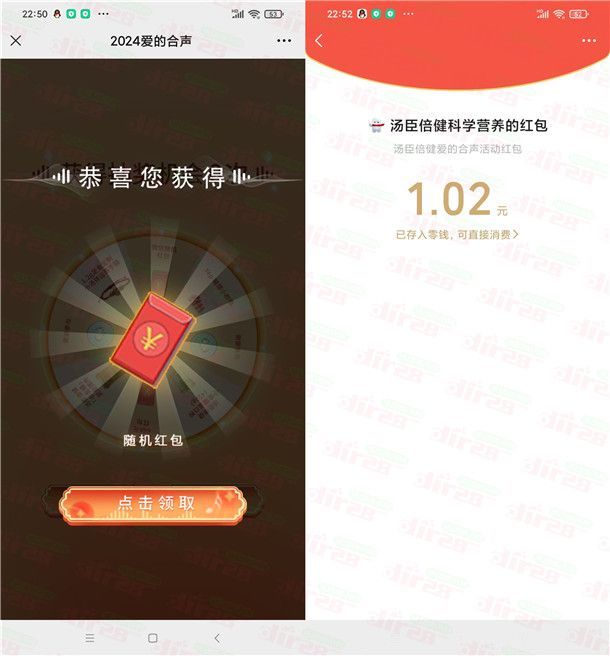 汤臣倍健2024爱的合声抽2万个微信红包、实物 亲测中1.02元