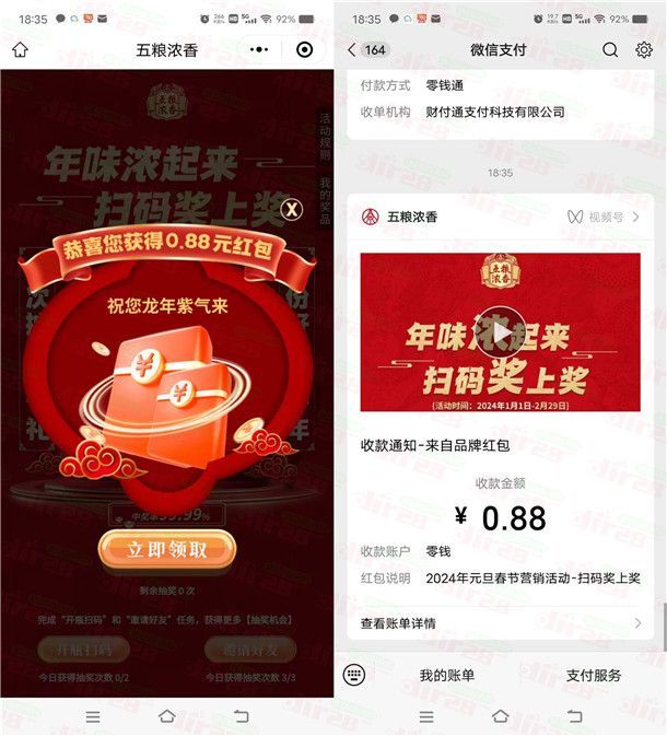 浓五的酒馆年味浓起来抽100万个微信红包、实物 亲测中0.88元