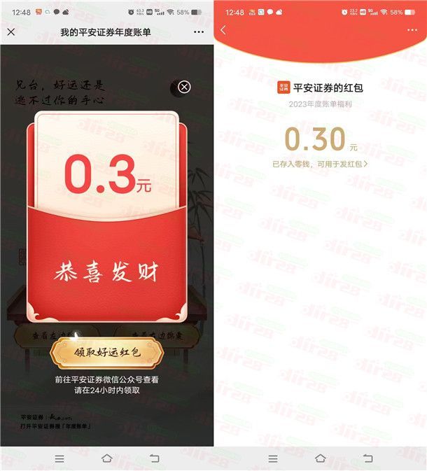 平安证券看2023年度账单抽0.3-188元微信红包 亲测中0.3元