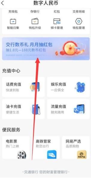打开交通银行APP搜索【数字人民币】进去中间滚动图片【交行数币礼月月抽红包】参与