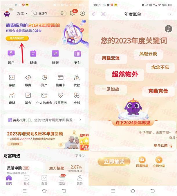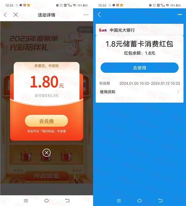 小编提示:打开光大银行APP,首页点顶部横幅【请查收您的2023年度账单】进去,下拉到底进去完成一个关注任务抽奖,刚中1.8元支付宝红包,秒到支付宝卡包里,注册过光大银行二类电子卡的也可以去