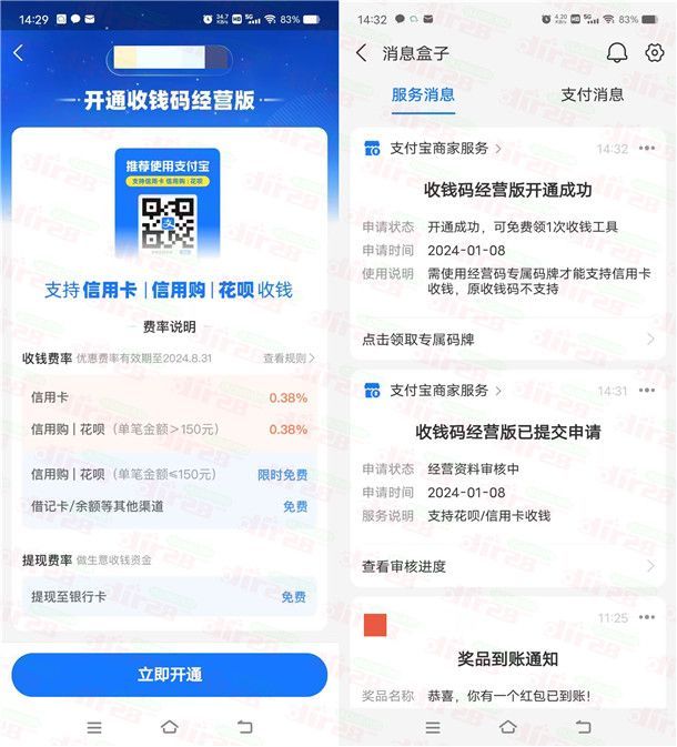 这是支付宝收钱码经营版的活动,所有个人用户都可以去开通参加,我们经常撸各种花呗红包、消费红包、信用卡红包的建议去开通一个,还是值得的(因为可以套),通过打开支付宝APP扫码进去活动里,信息也可以随便填,门头照片可以在百度或者在闲鱼随便找一张,目前有BUG,大概1分钟左右就会审核通过,另外还可以0元领取收钱码套装。