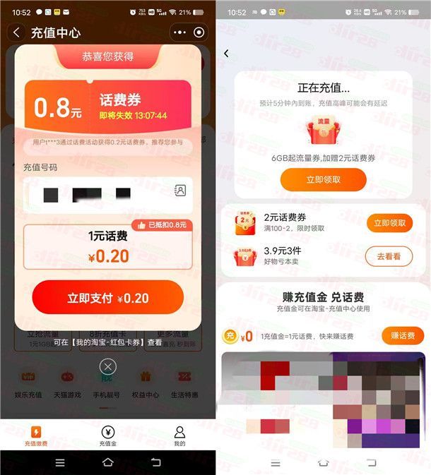 淘宝部分用户0.2充1元电信、联通手机号码 亲测秒到账