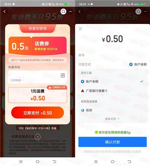 小编提示:打开淘宝APP扫码或者复制淘口令进去,弹窗会提示获得0.5元话费券(如果没有提示就换号看看),可以0.5充1元电信手机话费、部分地区联通号码也可以充1元抵扣,移动不行