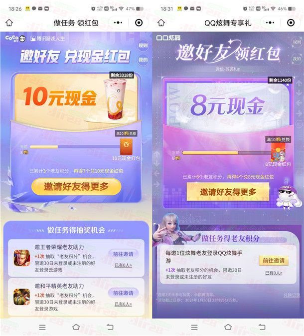 又来几个新的游戏人生的活动,微信和QQ都可以去参加,跟以往类似的活动一样,通过打开微信和手机QQ进去活动里,首次进去可以得到6个老友币,之后需要分享好友或者小号助力增加老友币,累积达到10个老友币可以兑换10元现金红包,多个活动都可以参加,数量限量。