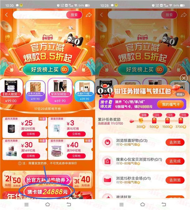 小编提示:打开淘宝APP扫码或者复制淘口令打开淘宝APP点弹窗进去活动里,点底部【集卡领24888元】每天完成简单的浏览任务可以得到福气值,累积达到500、1500、3700福气值可以分别领到2元、5元、11元淘宝无门槛红包