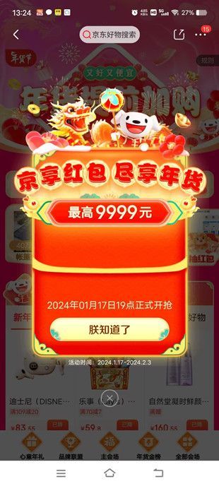 京东2024年货节的超级红包活动也开始了,也是今天开始,持续到2月3日每天都可以去参加领取,通过打开京东进去活动里,每天都可以领1个随机金额的京东现金红包(金额随机,每天都可以去,最高金额9999元),累积得到的红包可以多个叠加在京东购买任意实物商品无门槛抵扣使用。