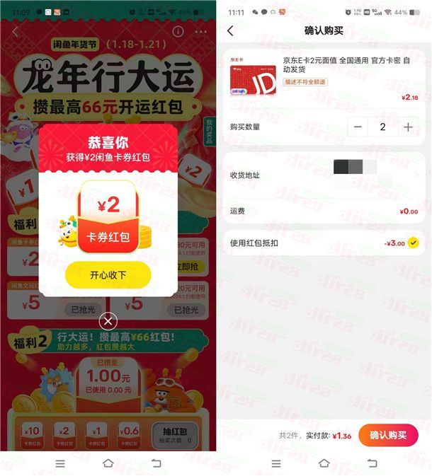 闲鱼龙年行大运活动领3-66元红包 可购买京东卡抵扣