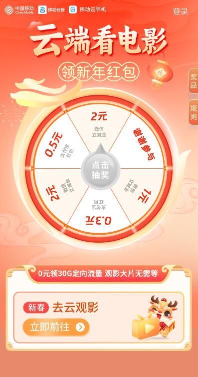 云端看电影领0.3-2元支付宝红包或立减金,三网用户都能参与,简单无脑。