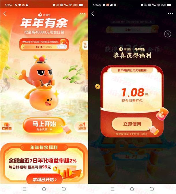 参加支付宝举办的年年有余抢最高48888元现金红包活动,通过打开支付宝APP进去活动里,完成页面指定的任务可以获得游戏次数,小游戏每累积得到1万个金币可以兑换1元余额宝消费红包,小游戏中也有机会中到随机金额的支付宝消费红包,得到的红包直接到账支付宝卡包里,可以在支付宝APP付款的时候选择用余额宝付款就可以抵扣。