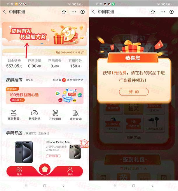 参加中国联通举办的支付宝限时签到抽话费活动,通过打开支付宝APP进去联通小程序里,指定日期签到可以领到抽奖次数,完成2个简单的浏览任务也可以抽奖2次,有机会中到1-5元手机话费,小编测试中到1元话费秒到,只认话费中到其他的没用,非必中。