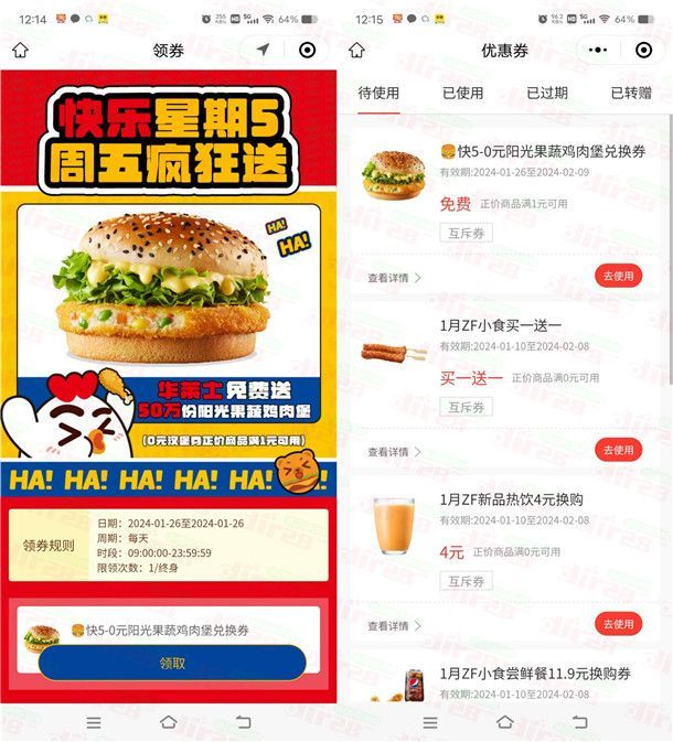 参加华莱士举办的快乐星期5周五疯狂送活动,通过打开微信进去活动里,每个人可以直接免费领到1个华莱士果蔬鸡肉汉堡兑换券,领到券后去线下华莱士点餐消费满1元可用,限量50万份送完即止,喜欢吃汉堡的可以去领取参加,买一个最低价格的单品就可以选择这张免费汉堡券一起用。