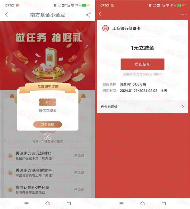工行南方基金小金豆抽1-500元微信立减金 亲测中1元