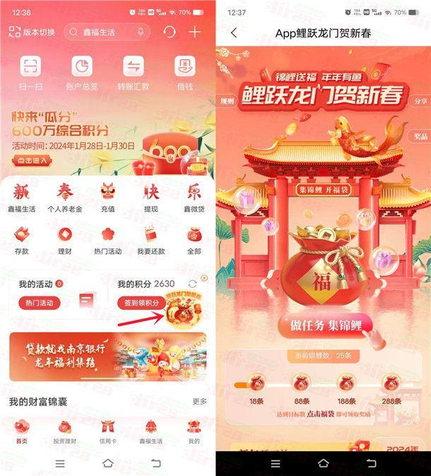 小编提示:打开南京银行APP,首页点右侧图标【鲤跃龙门贺新春】进去,点“做任务集锦鲤”进去,里面每个任务都点击进去再返回就可以得到锦鲤(全部任务做下来大概可以得到20个以上锦鲤),然后再返回来点击福袋抽奖,刚中10元盒马礼品卡,非必中