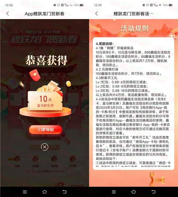 南京银行鲤跃龙门抽10元京东卡、盒马鲜生礼品卡 亲测中10元