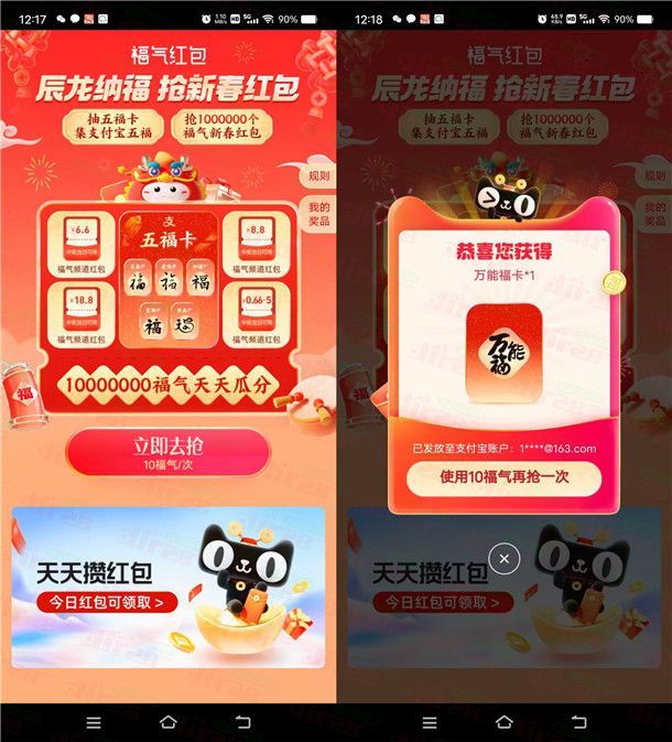 天猫10福气高概率抽支付宝万能福 亲测中1张万能福卡