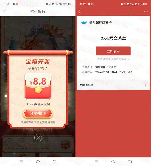 杭州银行赢新春好礼抽最高188元微信立减金 亲测中10.6元