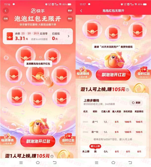 参加快手举办的泡泡红包无限开活动,通过打开快手APP或者快手极速版APP进去活动里,完成页面指定的任务可以获得红包,累积红包金额满20元提现,另外邀请30天未活跃的用户助力还可以参加排行榜,每天前2万名都可以获得现金红包,助力红包最低105元,最高5万元,所以这个活动的助力红包是比较粗暴给力的,也有好友已经领到了800多元现金红包,得到的红包可以提现到微信、支付宝。