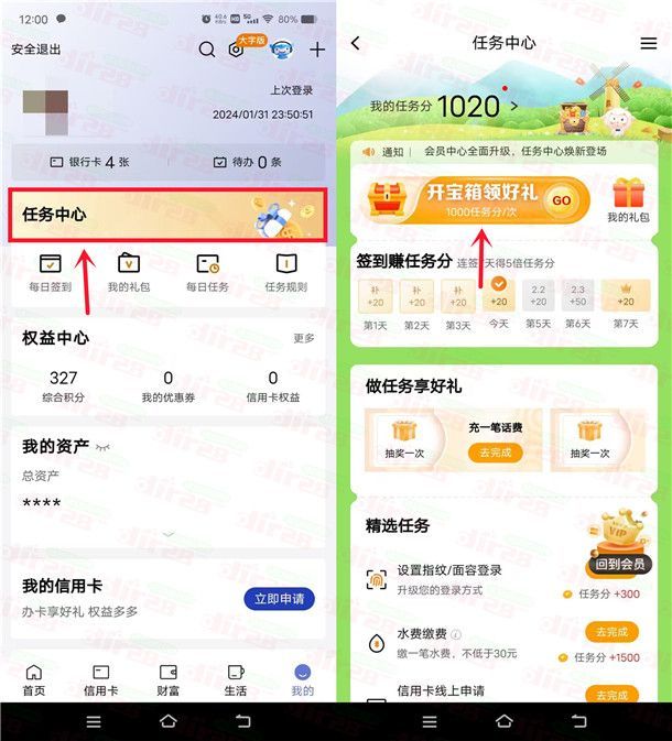 小编提示:打开中国建设银行APP,在【我的】页面点【任务中心】进去,先完成浏览任务领到1000个任务分,每消耗1000个任务分可以抽奖1次,刚中5元天猫超市卡,非必中