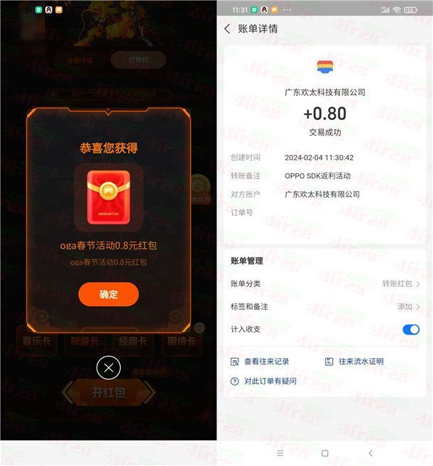 参加oppo游戏中心举办的OGA2023新年集卡开红包活动,这个活动所有安卓手机都可以去,通过打开oppo游戏中心APP搜索【OGA】进去活动里,下载活动页面的游戏以及预约游戏可以领到新年币,消耗新年币可以抽卡,只要集齐7张不同的卡片就可以开红包抽奖1次,有机会中到0.8-888元现金红包,小编测试中到0.8元,中到的红包需要手动提现到支付宝秒到,非必中。