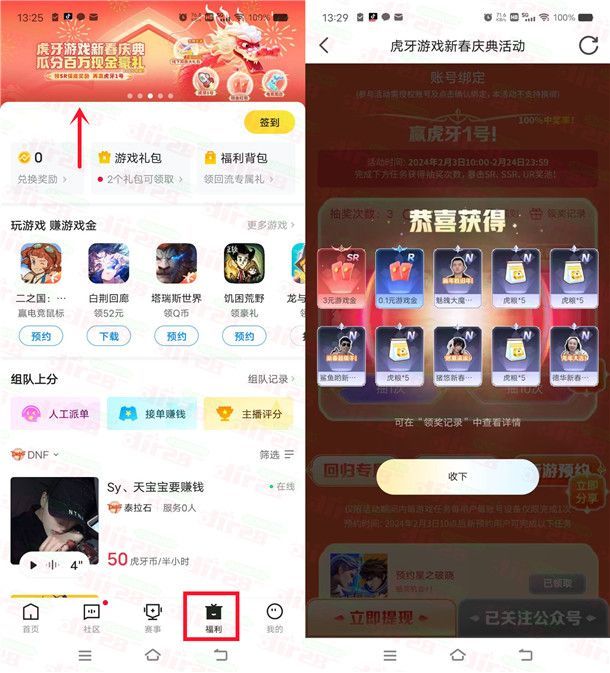 小编提示:下载打开虎牙直播APP,点底部【福利】再点顶部滚动图【虎牙游戏新春庆典瓜分百万现金豪礼】进去活动里,下拉页面完成多个游戏预约的任务可以领到10几次抽奖就会,直接10连抽,刚中3元红包,中到的红包需要手动提现到微信,非必中