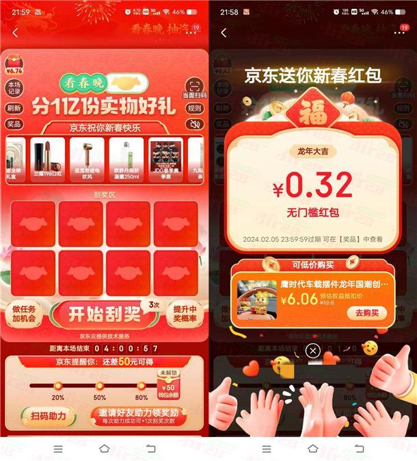 参加京东举办的瓜分春晚开门红包活动,通过打开京东APP进去活动里,每天完成指定的任务可以刮奖,有机会中到随机金额的无门槛红包、或者实物,在除夕晚上还可以瓜分千万无门槛红包、以及各类实物大奖,这个活动可以每天都去,也会有概率中到实物的。