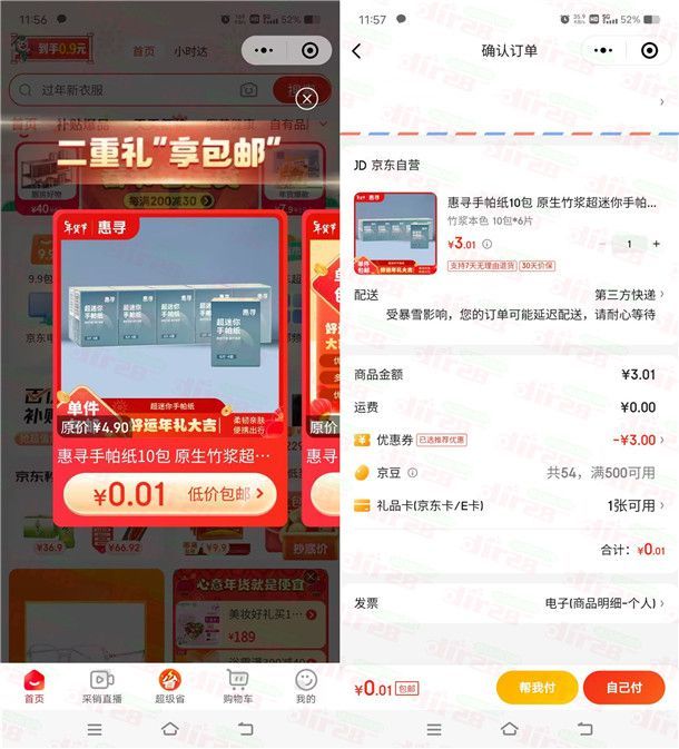 这个活动只有京东部分用户可以参加,通过打开微信APP进去购物页面,大部分人都会有弹窗提示0.01元购买实物商品,如果没有弹窗提示0.01元购买就说明不符合,小编亲测0.01元购买了10包手帕纸包邮,还是比较划算的,注册了京东的都可以去看看。