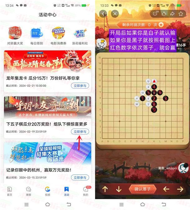 1、打开潮新闻APP,点底部【活动】再点【下五子棋瓜分20万奖励】进去活动里
