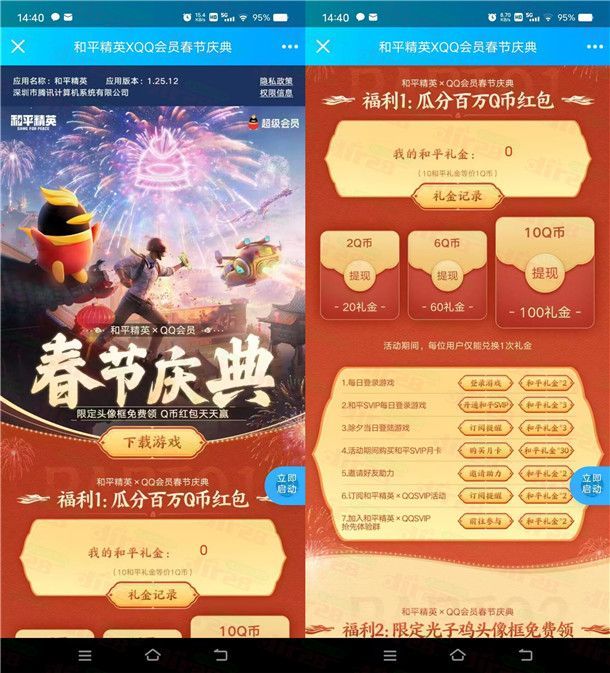 和平精英手游春节庆典领礼金兑换2-10个Q币 数量限量