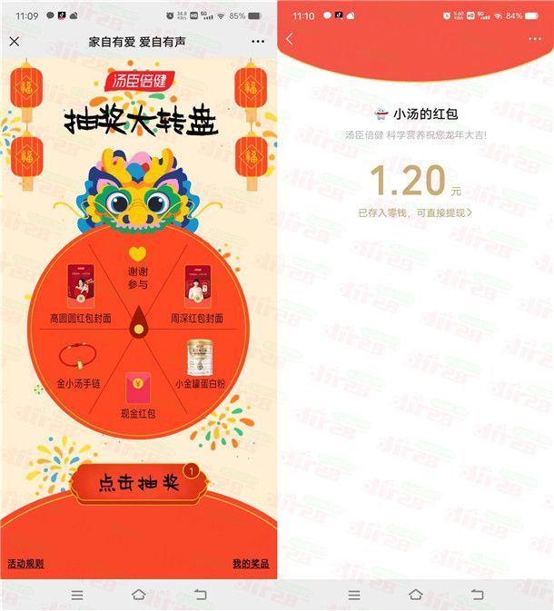 小编提示:进去随便录制一个语音,再分享给好友或者小号点击你分享的链接进去,大号和小号都可以抽奖1次,获得抽奖机会再关注公众号【汤臣倍健】回复【新年倍er健康】点推送的链接进去抽奖,刚中1.2元,非必中