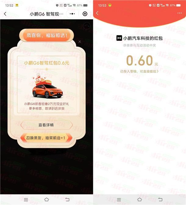 参加小鹏汽车举办的新春开吉6现金6连发活动,通过打开微信进去小程序活动里,首次进去按照提示可以拆开红包抽奖1次,分享好友助力还可额外增加2次机会,加起来最多3次机会,刚中0.6元,一共有奖金50万个红包,非必中。