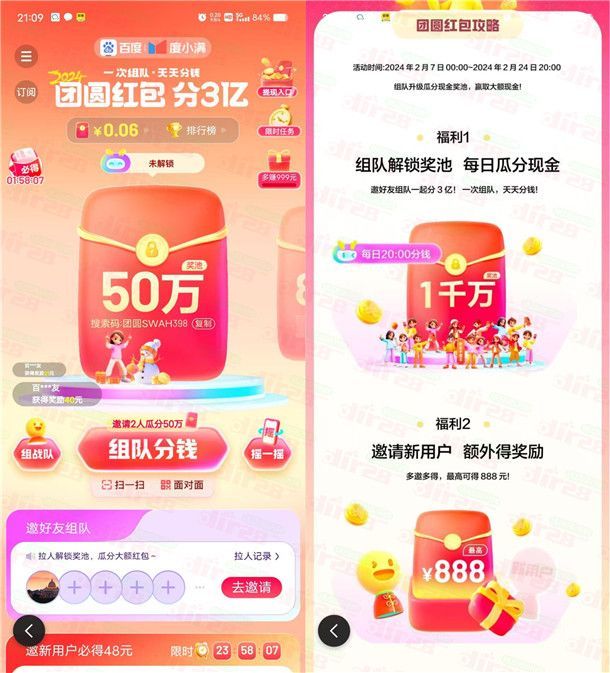 百度团圆红包 组队瓜分3亿元现金红包 每天晚上20点瓜分